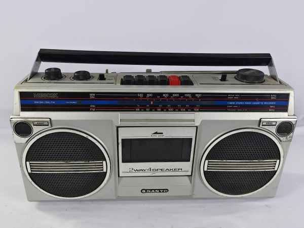 • Antigo rádio gravador boombox vintage Sanyo M9802K, da década de 80, toca AM/FM e toca-fitas cassete, item não testado
