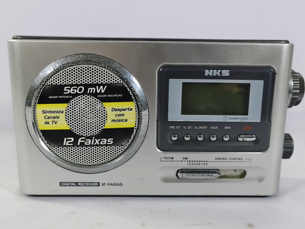 • Antigo rádio receptor portátil da marca NKS, modelo receptor digital 12 faixas, toca AM/FM e ondas curtas (10 faixas), possuí relógio digital, função despertador e capacidade de sintonizar canais analógicos, item ligando ao por na tomada porém não testamos suas funcionalidades