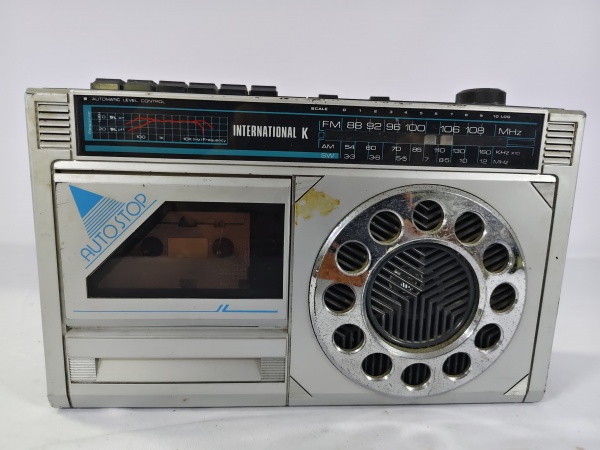 • Antigo rádio gravador vintage da marca International K, da década de 70-80, toca AM/FM/SW e reprodutor/gravador de fita cassete, liga ao por na tomada porém não testamos suas funcionalidades