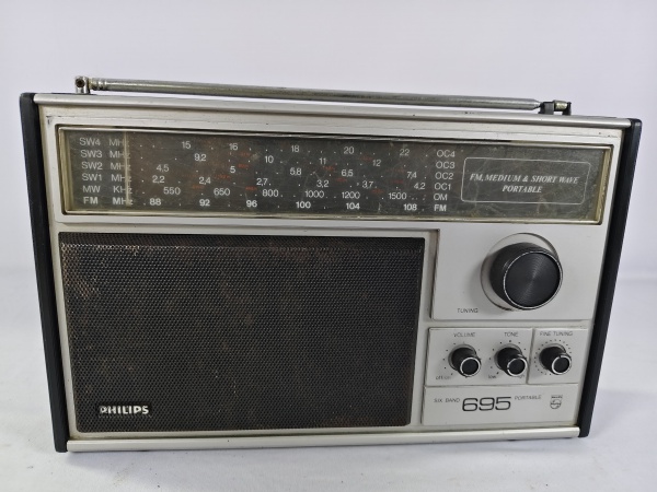 • Antigo rádio Philips Six Band 695 da década de 90, rádio portátil com seis faixas de onda "Six Band", toca FM/MW/OM/SW, item liga ao por na tomada porém não testamos suas funcionalidades