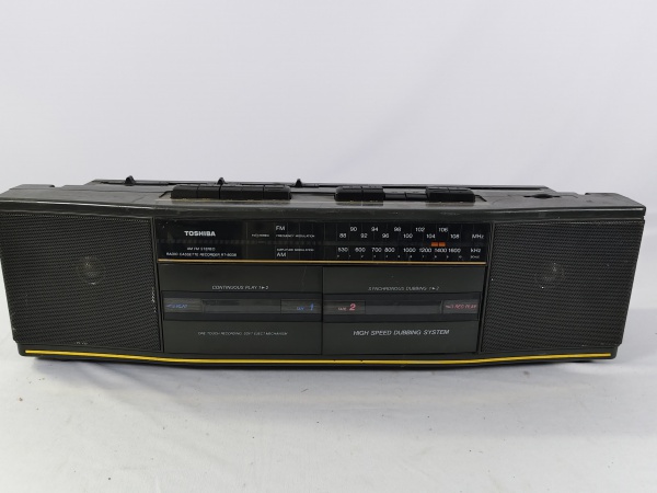 • Antigo rádio gravador de cassetes Toshiba RT-8038, toca rádio AM/FM e gravador de fita cassete, da década de 80, liga ao por na tomada porém não testamos suas funcionalidades