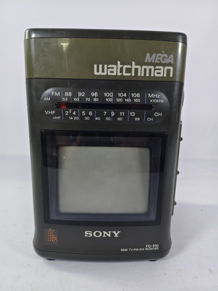 • Antiga televisão portátil da SONY Mega Watchman FD-510 da década de 90, possuí antena telescópica e sintonizador analógico para canais VHF/UHF, item liga ao por na tomada porém não testamos suas funcionalidades