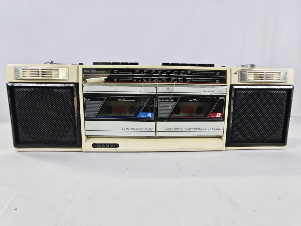 • Antigo rádio boombox vintage da marca Sanyo modelo M-W150, da década de 80, toca rádio cassete, rádio AM/FM com alto falantes integrado, item liga ao por na tomada porém não testamos suas funcionalidades