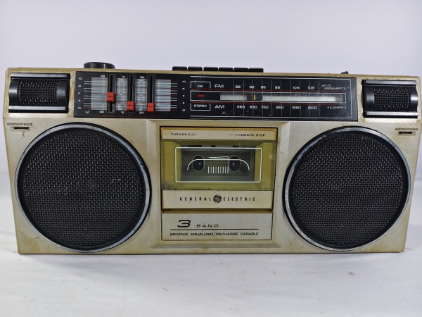 • Antigo rádio boombox portátil da marca General Electric modelo 3-5455B, toca AM/FM e reprodutor de fitas cassete, item não testado