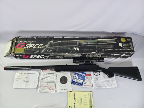 • Rifle de Airsoft Tokyo Marui, modelo VSR-10 Pro Sniper G-Spec, modelo clássico de ferrolho (bolt-action), funcionamento por mola (air-cocking), acompanha silenciador removível, manual, panfletos, declaração de contéudo e caixa