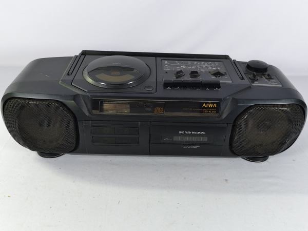 • Antigo rádio Cassete Aiwa portátil, reprodutor de CDs e toca fita integrado, possuí rádio AM/FM da década de 90, o item liga ao por na tomada porém não testamos suas funcionalidades