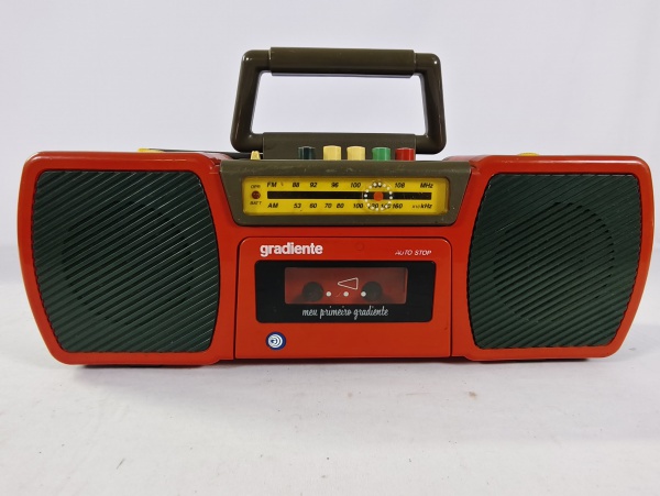 • Antigo rádio da década de 80 "Meu primeiro Gradiente", gravador e reprodutor de fita cassete e rádio AM/FM, item liga ao por na tomada porém não testamos suas funcionalidades