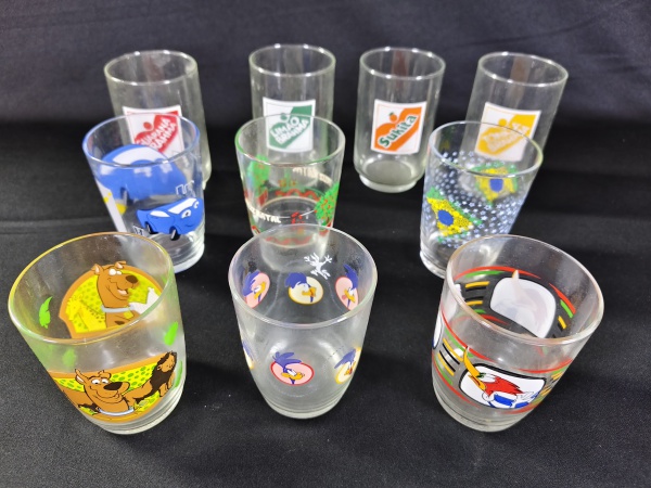 • Conjunto de copos de vidro com estampas de desenhos e bebidas