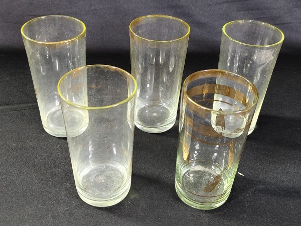 • Conjunto de cinco copos cilíndricos para bebidas, com faixas douradas na borda
