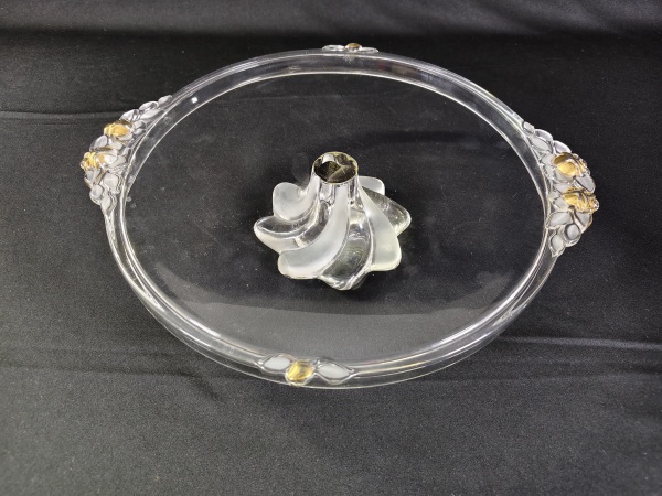 • Lindo prato de bolo de critais/ vidro com pés e alças douradas medindo aproximadamente 30 cm.