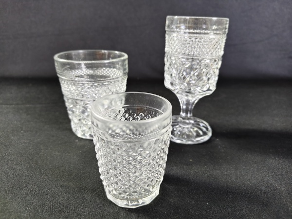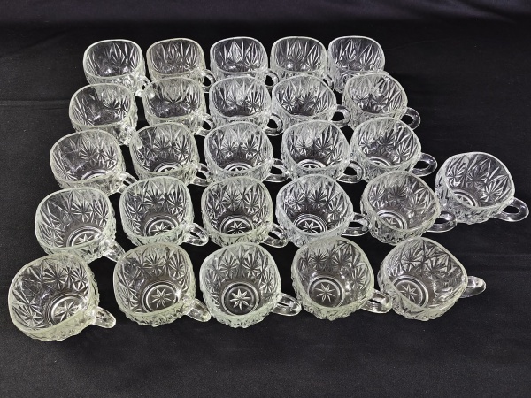 • Conjunto de 26 unidades de xícaras de ponche de vidro prensado da marca Hazel Atlas, no padrão Williamsport Square.