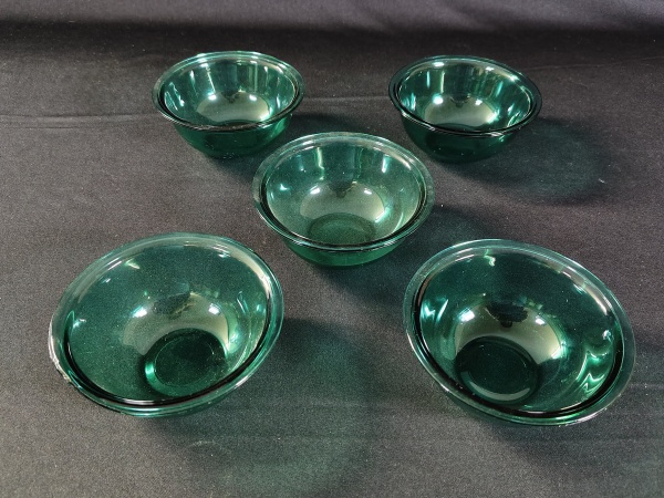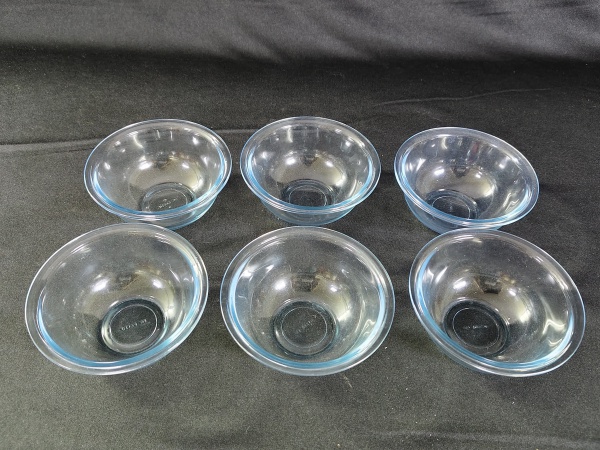 • Conjunto com cinco tigelas pequenas de vidro tipo pyrex com um tom azulado.