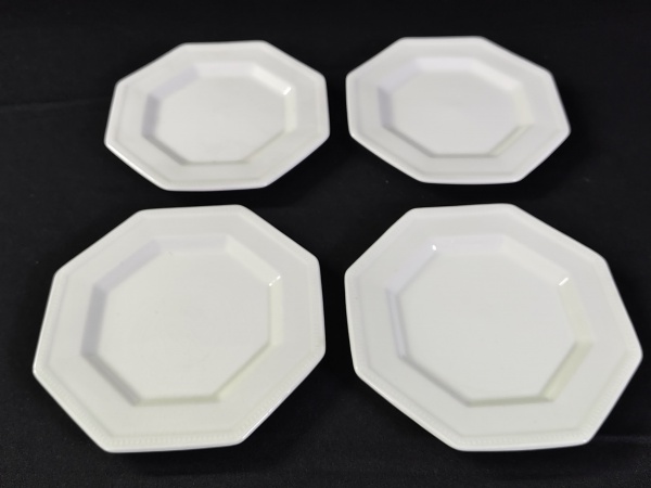 • Conjunto de quatro pratos de sobremesa oitavados rasos brancos porcelana/ cerâmica.