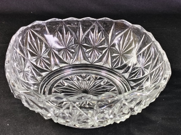 • Saladeira de cristais/ vidro moldado, com um padrão geométrico detalhado medindo aproximadamente 8 x19 cm.