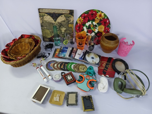 • lote com cestas de palha, porta copos, copos de plasticos, pequenos porta retratos, itens decorativos e outros