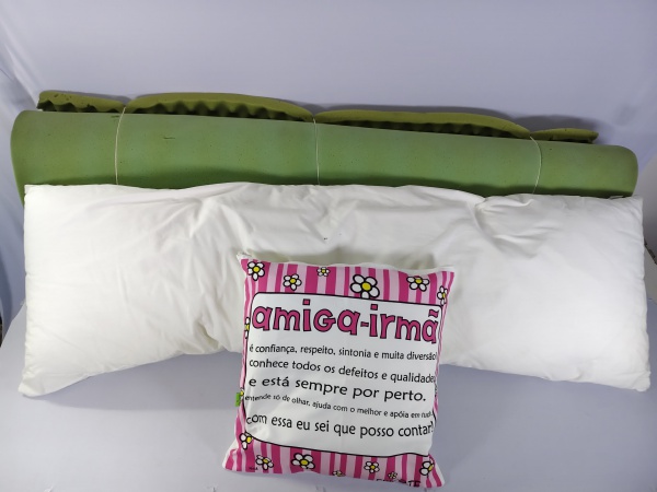 • Travesseiro de corpo, com almofada de estampa rosa, e topper de colchão