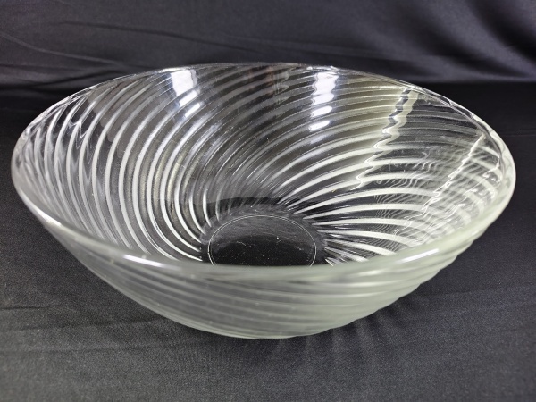 • Tigela de vidro com detalhes em relevo em aspiral, sem trincas, lascas ou desgastes aparentes, com 28cm diâmetro