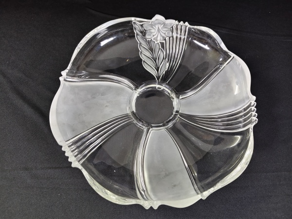 • Petisqueira de vidro com detalhes de flores fosca e transparentes, com 30cm de diâmetro