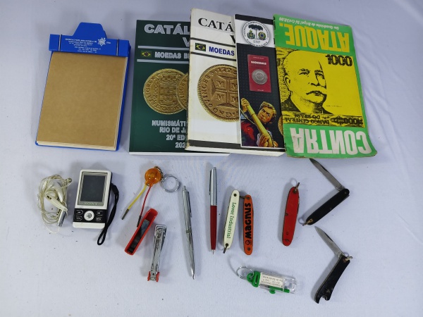 • Lote com catálogos de moedas canetas, chaveiros e canivetes antigos