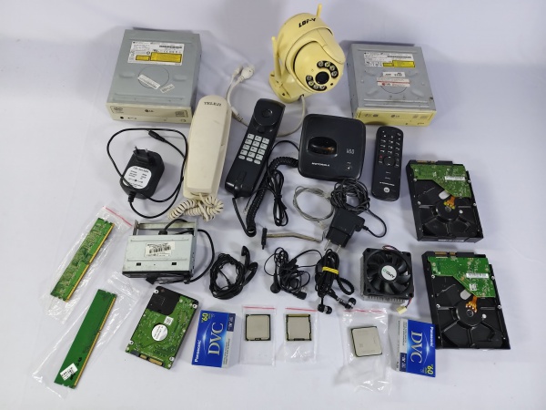 • Lote com acessórios antigos para computador, incluindo três preocessadores, telefones e outros