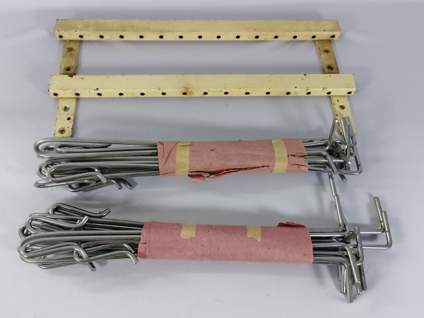 • Ganchos e hastes de metal utilizados para organização e exposição de produtos em painéis