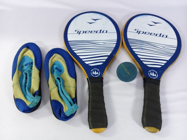 • Par de sapatilhas aquáticas e duas raquetes e uma bola, da marca Speedo, em perfeito estado