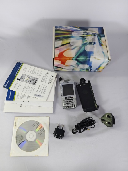 • Antigo celular BlackBerry com manuais, panfletos, cabos e na caixa