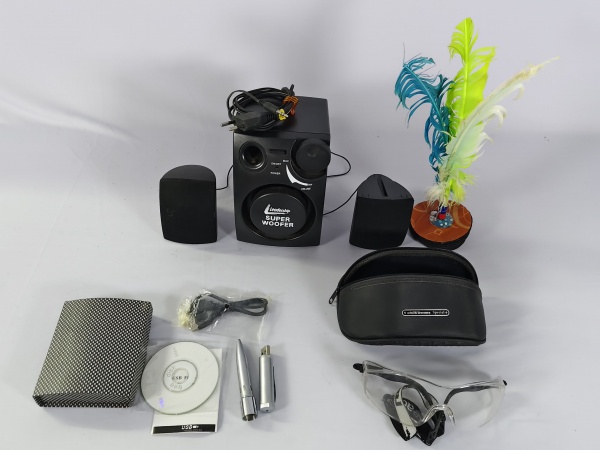 • Lote com alto falantes, óculos com caixa, peteca e outros itens