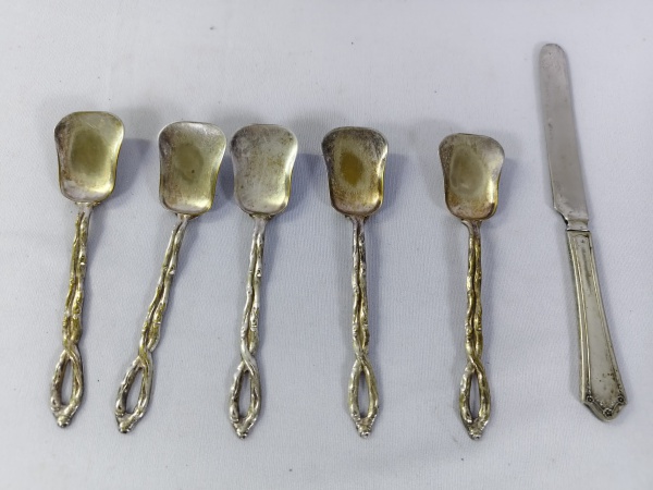 • Cinco colheres com cabo em detalhes com relevos entrelaçados e uma faca prateada
