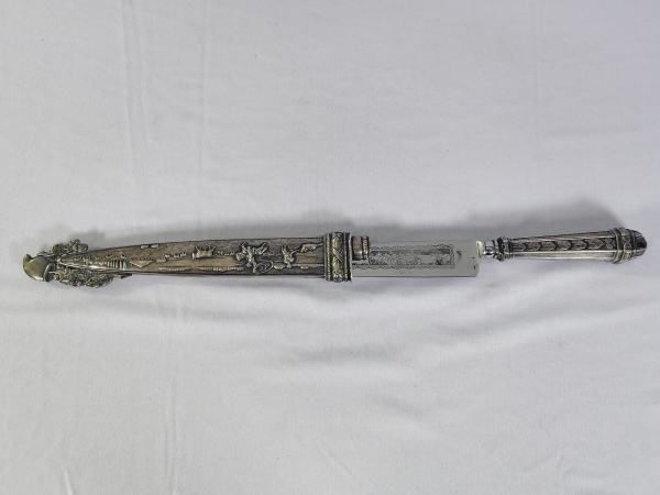 • Antiga faca de Inox motivo "gaucha" na lamina com detalhes em relevo no cabo e na capa protetora