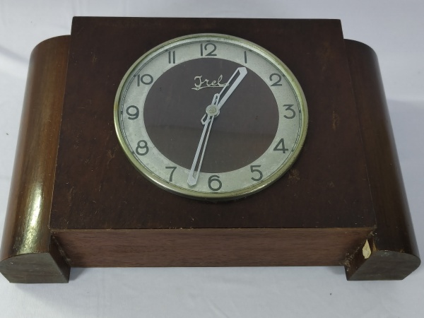 • Antigo relógio de mesa vintage em madeira, da marca Irel