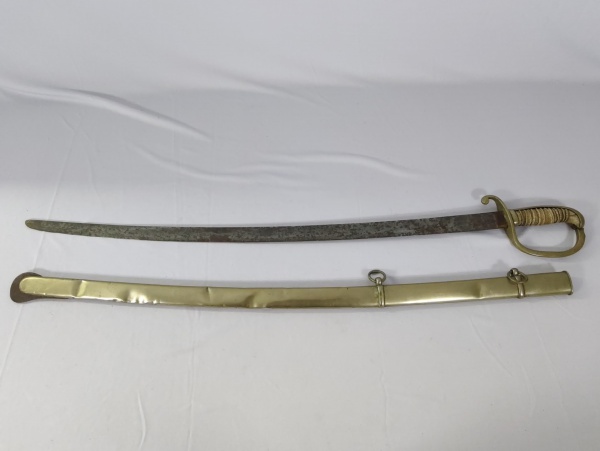 • Antiga espada / sabre militar com lâmina curva e capa protetora de metal, med. 90cm