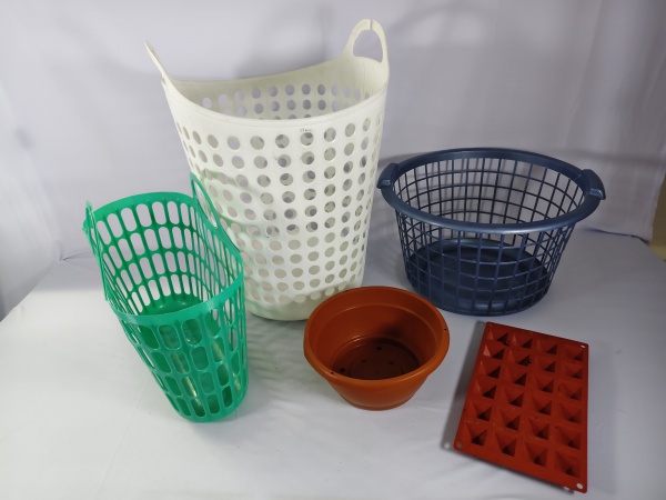 • Kit com cinco itens, sendo 3 cesto , um vaso de plantas e uma forma de cubos de gelo em cilicone.