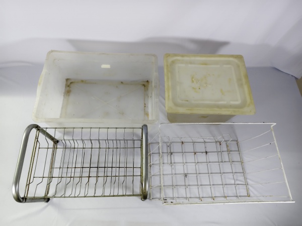 • Kit com quatro peças, sendo um escorredor de louças, uma cesta e dois potes quadrados sendo um com tampa.