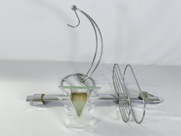 • Lustre / Luminária com formato em X cruzado com base em metal e cúpulas de vidro, ideal para iluminação decorativa como sala de jantar ou estar.