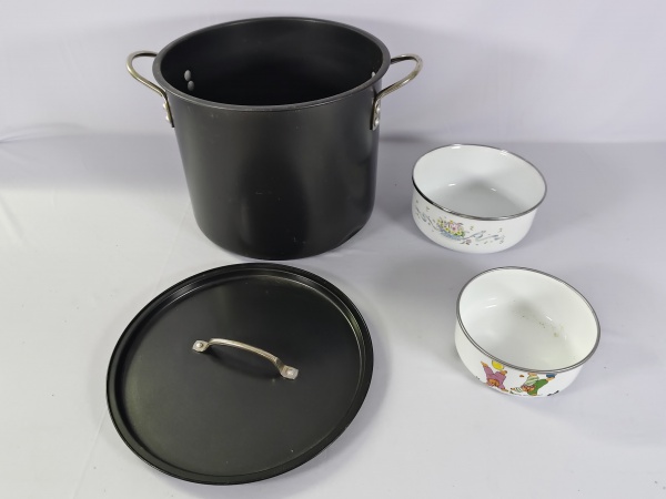• Kit com três panelas sendo uma , um caldeirão de aproximadamente com 27 cm, e duas panelas menores.