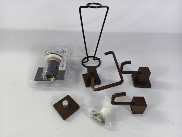 • kit com seis peças , com suporte de toalhas e papel higiênico, uma válvula de lavatório e itens a descrever.