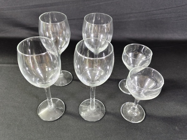• Conjunto de seis taças contendo quatro de vinho e duas menores, cristal/ vidro.