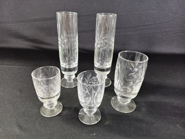 • Esse conjunto contém duas taças de champagne e três taças com delicados desenhos em cristal/ vidro.