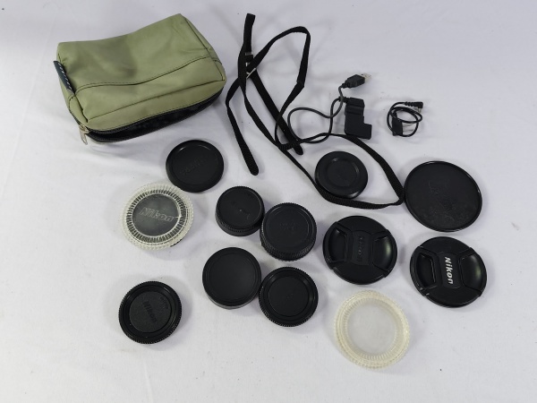 • Lote com tampas de lentes de diversas câmeras e pequena bolsa